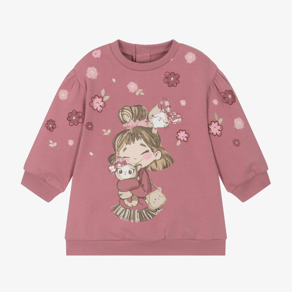 Очаровательное розовое платье свитшот для малышек от Mayoral из мягкого хлопкового трикотажа средней плотности с флисовой подкладкой. Спереди изображена милая девочка, обнимающая кошечку, окруженная розовыми цветами и золотыми блестками для дополнительного сияния. Повседневный стиль с длинными рукавами и заниженными плечами, ребристыми краями и застежками на кнопки сзади.