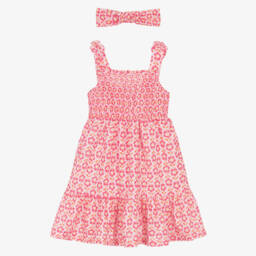 A lovely pink, sleeveless sun dress for girls by Mayoral, patterned with a vibrant pink and orange floral design. Made in lightweight cotton, it features a shirred bodice for a great fit and pretty fixed bows on the shoulder straps. A matching headband with an elasticated back and a bow on the front completes the look.