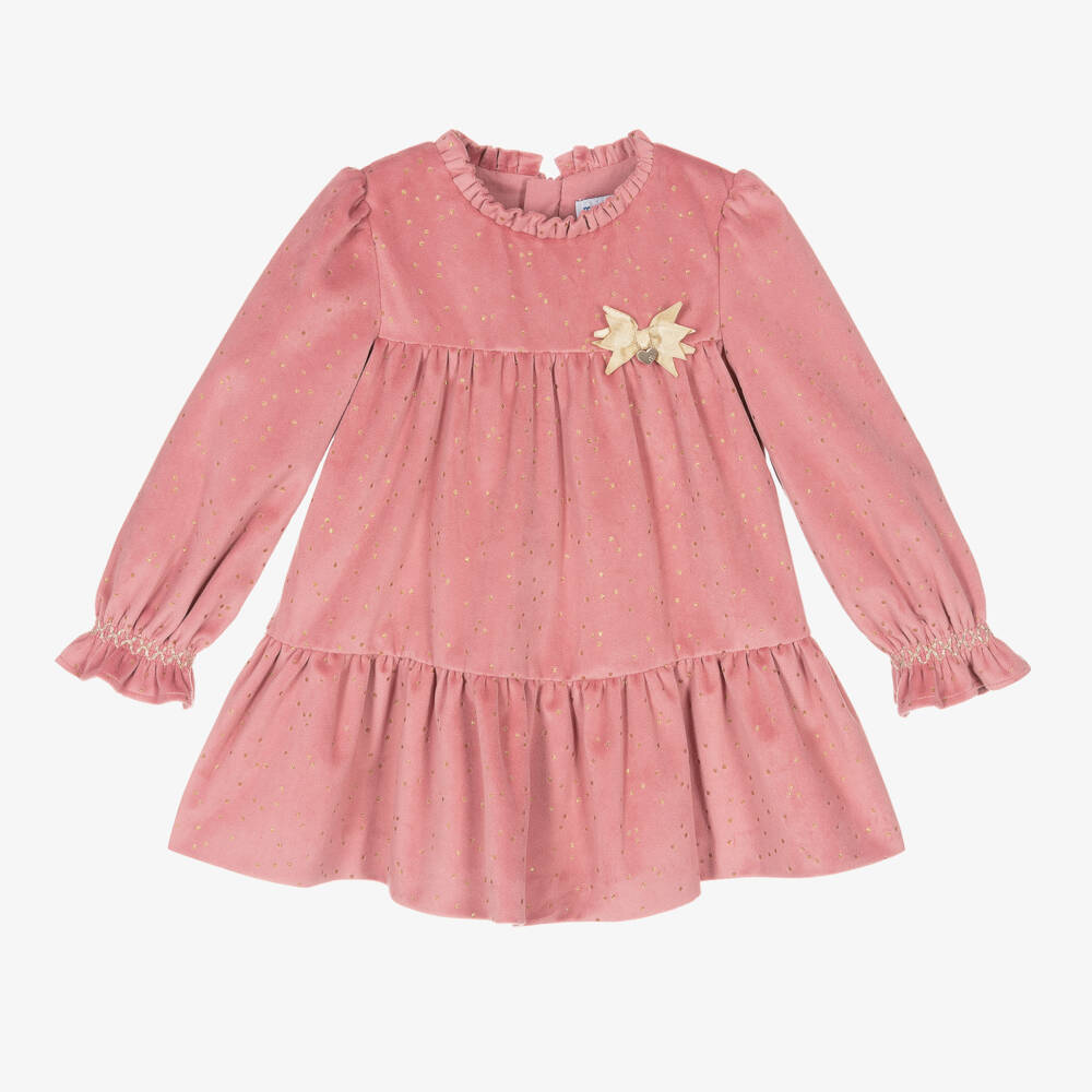 Beautiful pink velvet dress for little girls by Mayoral, lovely for a smart occasion. Soft and mid-weight, it is patterned with sparkly gold dots and has a sweet ruffle collar and smocked cuffs. Prettily gathered for a flared shape, the dress has a comfortable lightweight cotton lining and fastens neatly with a concealed zip on the back.