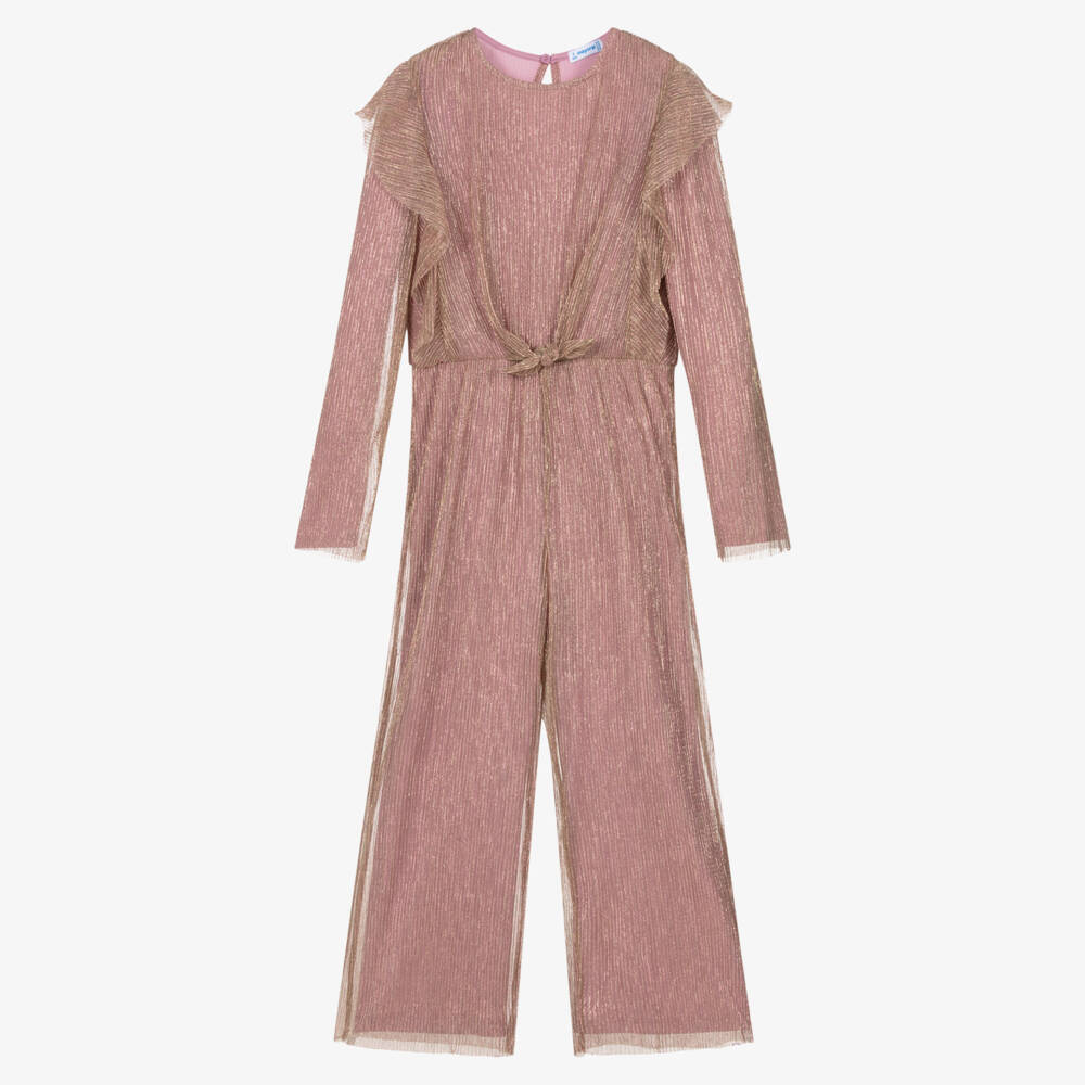 Shimmering in pink and gold, this glamorous jumpsuit for girls by Mayoral. The sheer and lightweight plissé fabric is lined in silky soft jersey, with a gently elasticated waist for a comfortable fit. The bodice has a ruffle trim and ties into a knot on the front. There is an elegant keyhole button fastening on the back.