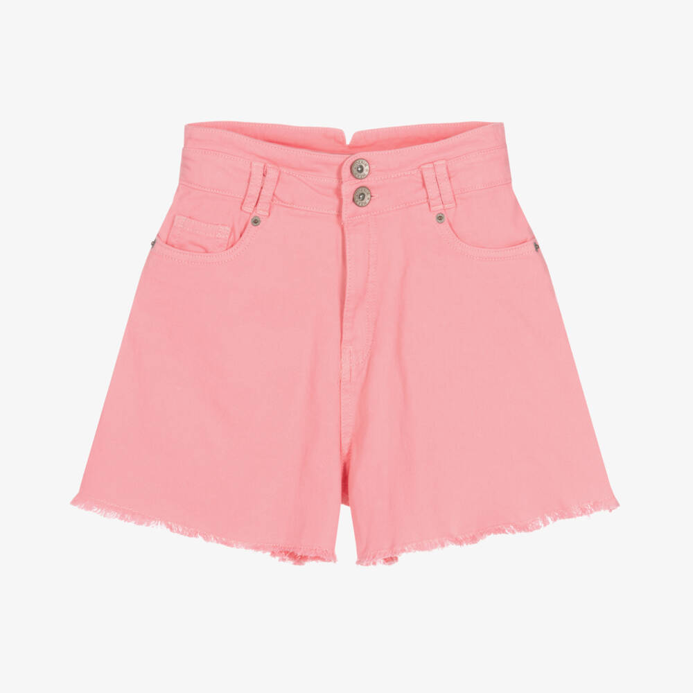 Stylish neon pink shorts for girls by Mayoral, made in sustainable cotton denim with a comfortable stretch. Lovely for warmer days, they have a wide leg shape with frayed trims for a laidback feel. The high waistline has an adjustable feature, promising comfort during wear. They fasten with buttons and a zip on the front, and have logo embossed rivets for subtle branded detailing. A rose logo badge debuts the back of the waist, adding a touch of glamour to this versatile style.