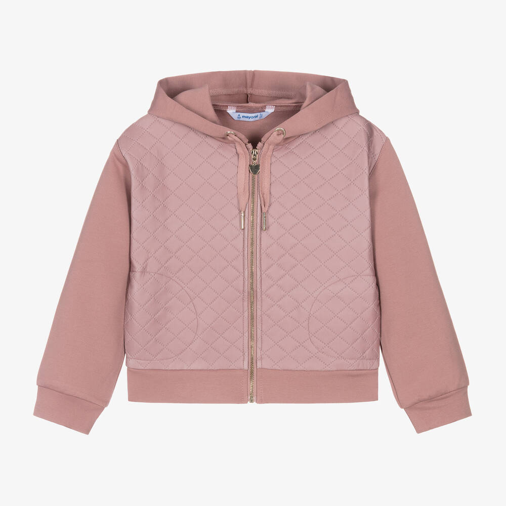 Pink hooded zip-up top for girls by Mayoral, made in soft Milano jersey. Elevating the casual style, it has a quilted, faux leather front and useful side seam pockets. To complete the look, the hood is detailed with faux ties and the gold tone zip fastening has a lovely heart-shaped pull.