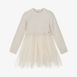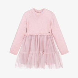 Очаровательное розовое платье для маленьких девочек от Mayoral сочетает уют вязаного джемпера и элегантность юбки из тюля. Теплый и комфортный лиф украшен красивыми волнистыми краями и вышитыми цветами на плечах. Пышная юбка из тюля имеет подкладку для удобства, а платье застегивается на пуговицы сзади.