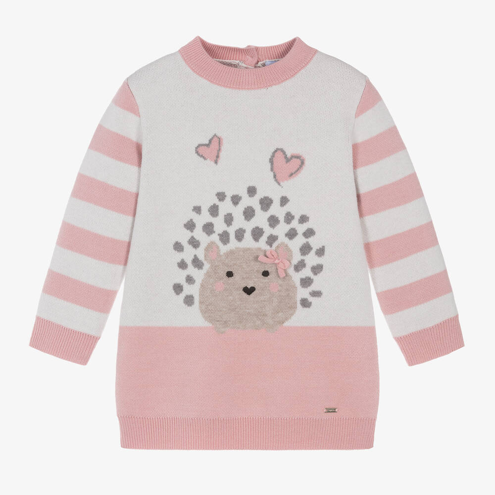 A pink and ivory long-sleeved jumper dress for little girls by Mayoral, ideal for the cooler temperatures. Knitted in a super soft and cosy viscose blend, it has an adorable hedgehog design on the front, with embroidered detailing and appliqué bow trims. It fastens with buttons on the back for a neat finish. This item contains recycled fibres.