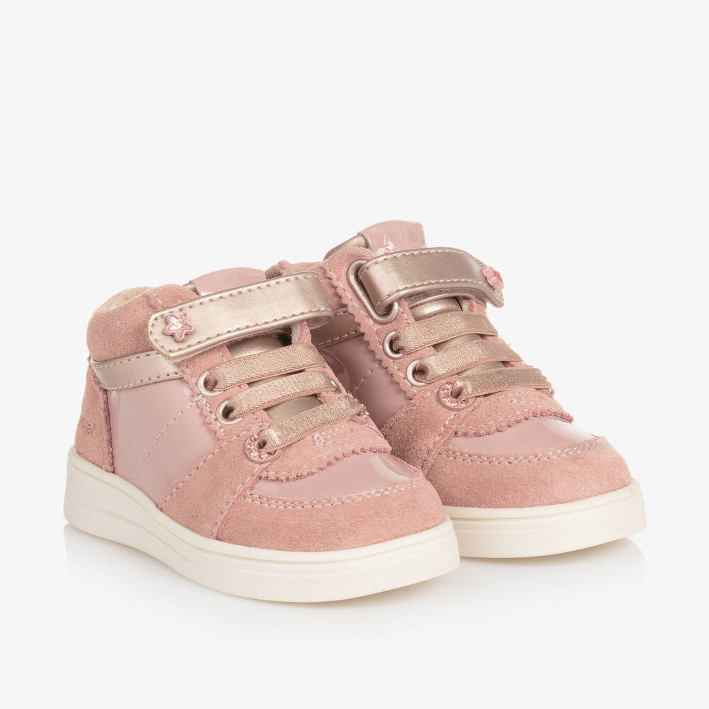 Lovely pink trainers for little girls by Mayoral, in soft suede leather with faux leather trims. Easy to slip on, with elasticated satin laces, they have a velcro strap for an adjustable fit, detailed with a sparkly diamanté star. Comfortably lined in soft cotton corduroy with padding around the ankles, they have a removable, cushioned insole that is antibacterial and odour inhibiting. They have a flexible non-slip rubber outer sole, patterned on the bottom for extra grip.
