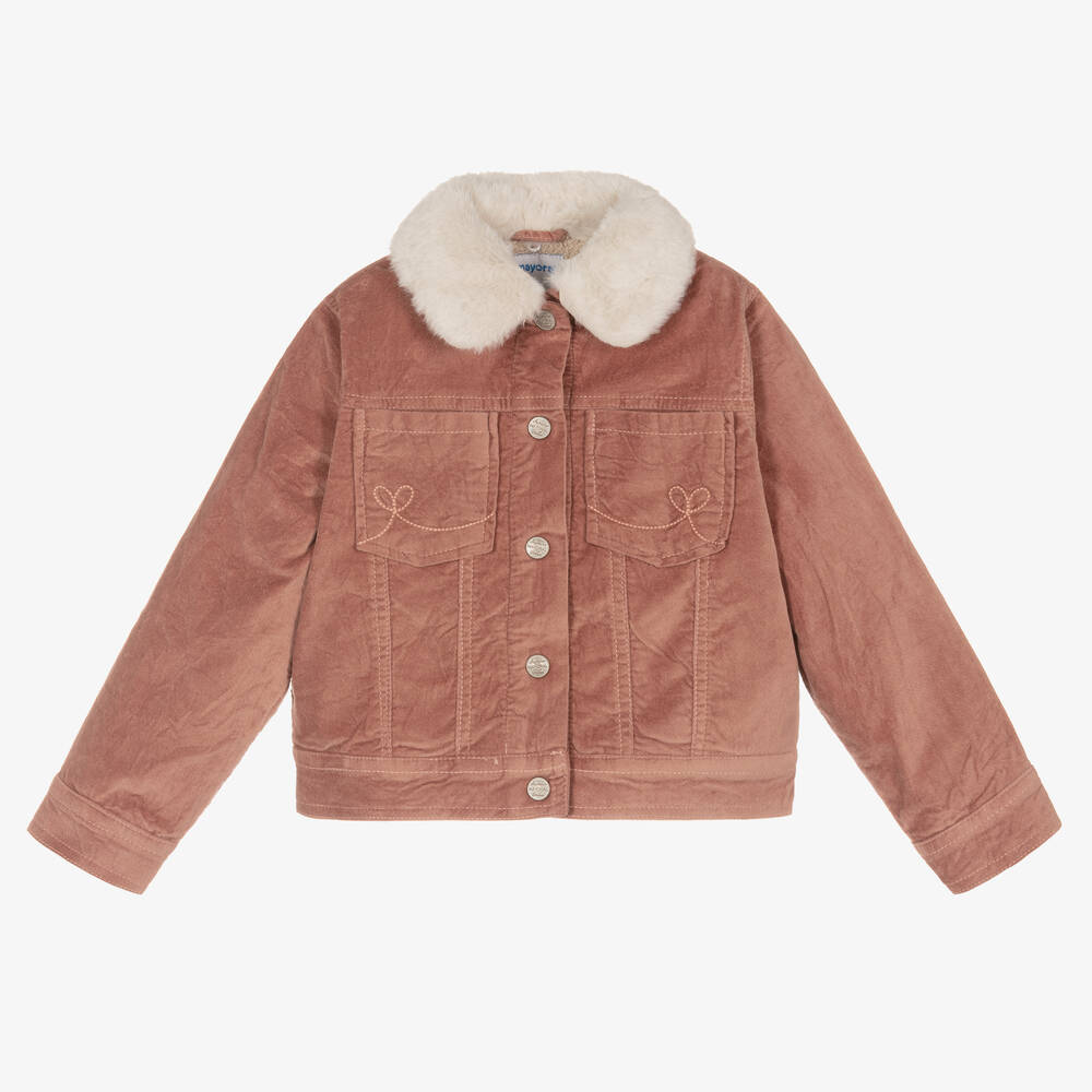 Terracotta pink jacket for girls by Mayoral, made in soft cotton velvet, with a detachable ivory faux fur collar. It has easy to use silver, branded popper fastenings on the front and flap pockets. Beautifully lined in cosy beige bouclé, there is a brown faux leather logo patch on the back.