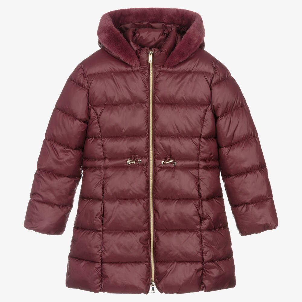 Gorgeous purple puffer coat for older girls by Mayoral, lined in soft plush faux fur for cosy comfort. The waist is detailed with a drawstring trim, allowing the coat to be adjusted at the waist for locked in warmth and a feminine silhouette. Fastening with an exposed gold zip, it has concealed front pockets and faux fur hood trim for a stylish look. This item contains recycled fibres.
