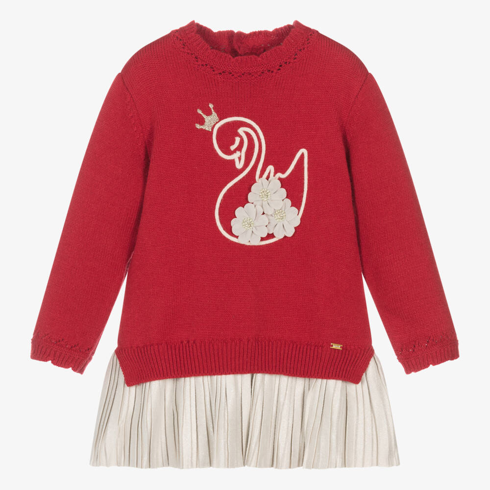 Red and beige dress for little girls by Mayoral, knitted in a soft viscose blend. The sweater-style top has a lovely swan motif on the front, trimmed with 3D flowers and sparkly gold embroidery. It has a sweet scalloped neckline and matching trims on the cuffs. For a contrasting look, the sparkly beige skirt is pleated for a girly style. This pretty dress fastens with simple buttons on the back of the neck.