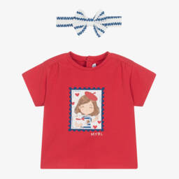 Эта красная футболка от Mayoral станет прекрасным дополнением гардероба маленькой модницы. Изготовлена из мягкого хлопкового трикотажа, она украшена очаровательным принтом с девочкой и птицей спереди и красными сердечками. Застегивается на кнопки сзади для удобства одевания. Для завершения образа в комплекте идет повязка с узором в сердечки и милым бантиком спереди.
