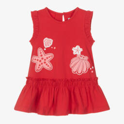 Vibrant red and white swimsuit for little girls by Mayoral, patterned with an array of seashells. Made in silky smooth, stretchy fabric, it has pretty ruffle trims and a playful cut-out detail on the back.