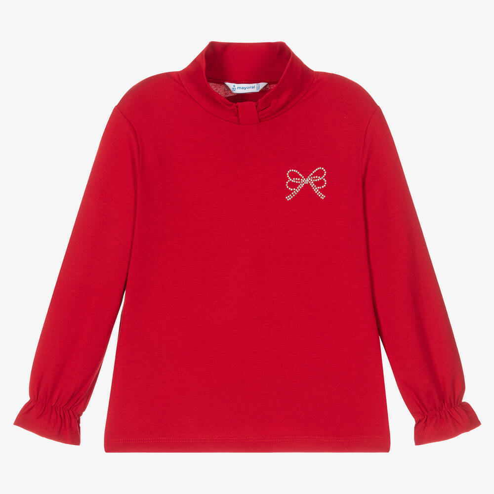 Red sweater for girls by Mayoral, with a decorative knot on the turtle neck. Made in a beautifully soft and lightweight viscose blend, it is comfortable to wear and eye-catching too, with a shiny silver-studded bow on the chest. The cuffs are prettily frilled and gently elasticated.