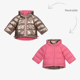 Younger girls reversible, hooded puffer coat from Mayoral. The one side is metallic gold and the reverse side is pink, and both sides are made in silky-feel nylon. Warmly padded, it has a front zip fastening and faux drawstring toggles on the hem.
