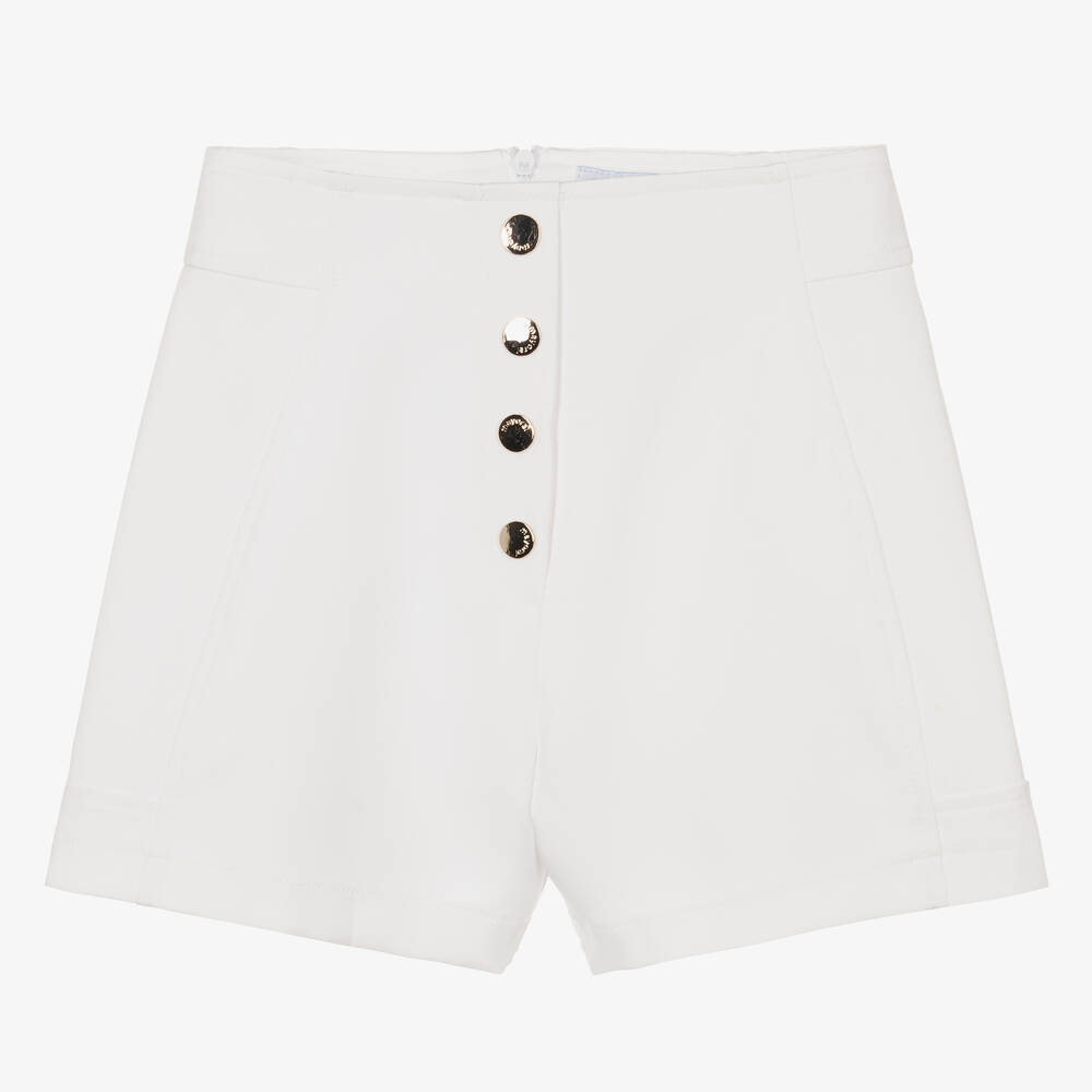Chic white shorts for girls by Mayoral, with decorative branded metal studs on the front. Soft with a luxuriously smooth feel, they have a gentle A-line shape and fasten with a concealed zip on the back for a neat finish.