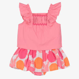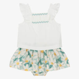 This lovely white and green skirt set for little girls by Mayoral, is made in lightweight cotton. The top is beautifully styled with ruffles and ric rac trim on the bodice and button fastenings on the back. The skirt features a pretty floral pattern in ivory and yellow. It has attached knickers and an elasticated waistband for comfort.