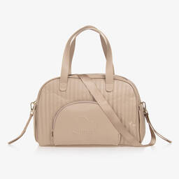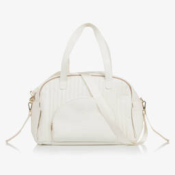 Кремовая пеленальная сумка из искусственной кожи от Mayoral со стеганым передом и бежевой отделкой. Прочная и очень вместительная для организации вещей малыша в дороге или в качестве сумки для ночевки. Имеет основное отделение на молнии с внутренними карманами. Также есть внешние боковые карманы для бутылочек и передний карман. Съемный и легко пристегивающийся плечевой ремень регулируется, а два ремешка для коляски крепятся к ручкам на липучке.