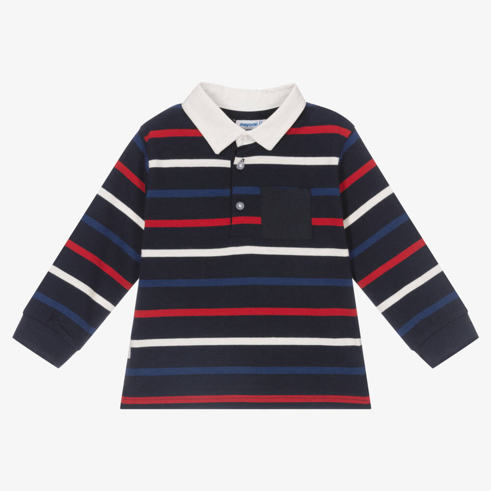 Navy blue rugby shirt for little boys by Mayoral, made in soft cotton jersey for comfort. With a white button-up collar, this smart top has an all-over red, white and blue striped pattern and a navy blue chest pocket. There are branded front button fastenings, making it easier to get over little ones' heads.