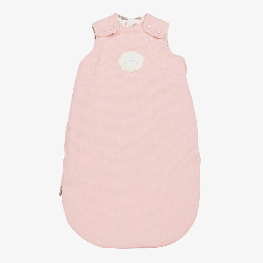 Cute pale pink sleeping bag for baby girls by Spanish brand Mayoral, with white lamb appliqué and embroidered logo on the front. Made in soft cotton-blend jersey with a textured square pattern, it is lightly padded for cosiness and lined in white jersey with a pink floral print. Fastening with a zip on one side and along the bottom, it also has adjustable poppers on the shoulders for added practicality. The size of the sleeping bag can be altered by folding up and fastening the bottom with poppers.