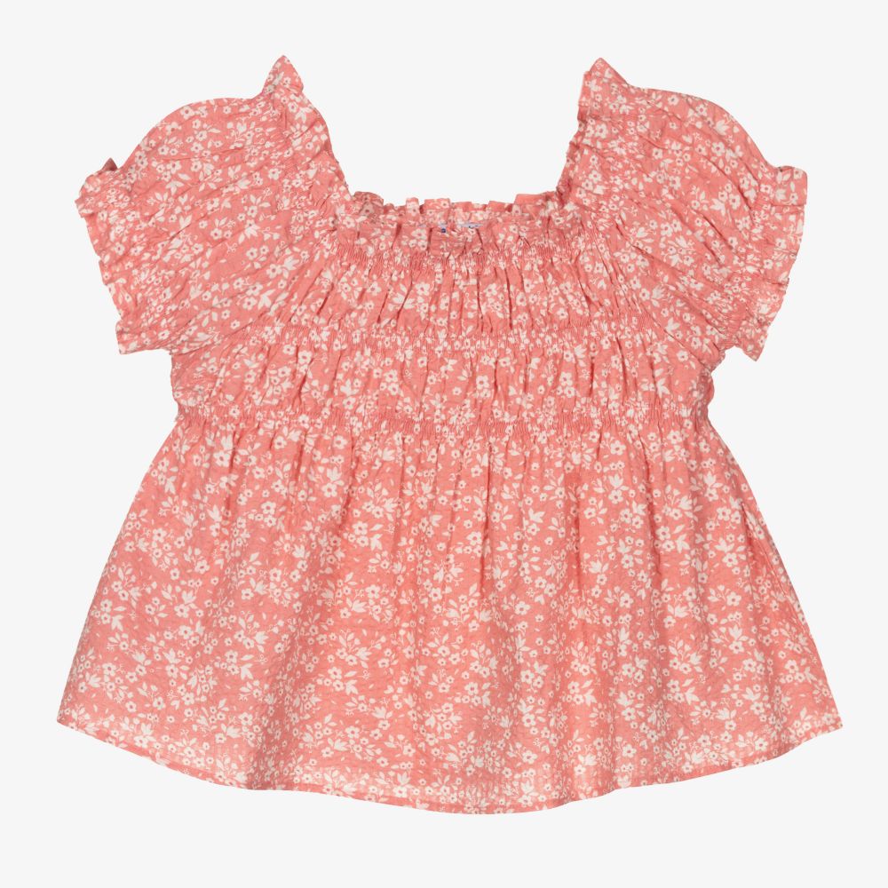 Pink floral cotton blouse for girls by Mayoral. Made in soft, lightweight seersucker, this pretty top has a delicate white floral print and a stretchy, ruched panel across the front, on the neckline and the sleeve cuffs.