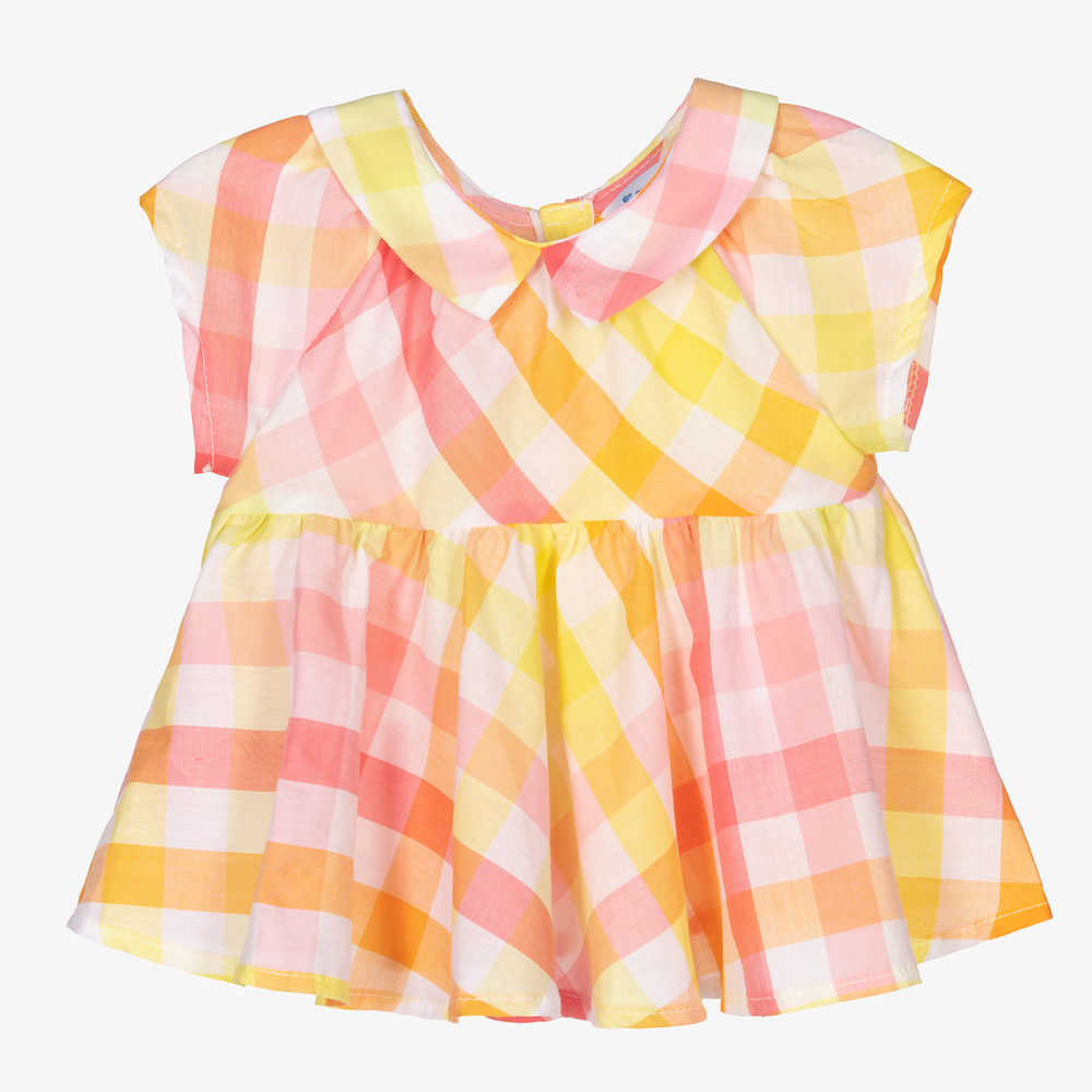 In a pink, yellow and white check, this lovely blouse for little girls is by Mayoral. Made in soft lightweight cotton, it has a pretty flared hem and back button fastenings.