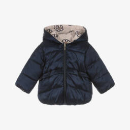 Reversible metallic puffer jacket for girls by Mayoral, made in recycled fibres. The iridescent purple-pink side has pockets on the front, whilst the silver side has concealed side pockets. There are drawstrings on the hood and hemline.