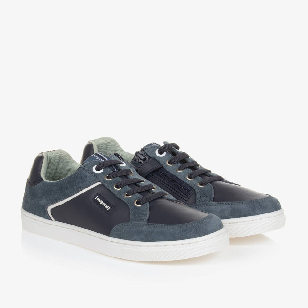 Navy blue trainers for teen boys from Mayoral, with logo prints and labels. They are panelled in a mix of smooth leather and grey-blue suede for an interesting multi-textured finish. These comfortable shoes have a soft cotton twill lining, which boast antibacterial, breathable and odour-inhibiting qualities. They have removable insoles and non-slip rubber soles for extra grip. The elasticated laces, zip and velcro tab ensure they are quick and convenient to put on.