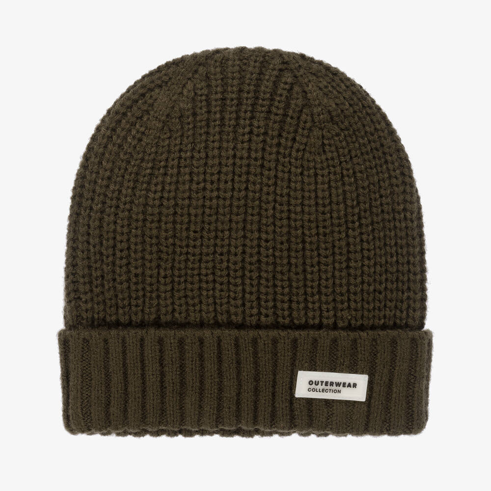 Khaki green knitted beanie for teen boys by Mayoral. The turn-up ribbed brim is detailed with a white rubberised logo badge for a subtle branding touch. Warm for cooler days, it is knitted in soft mid-weight acrylic.