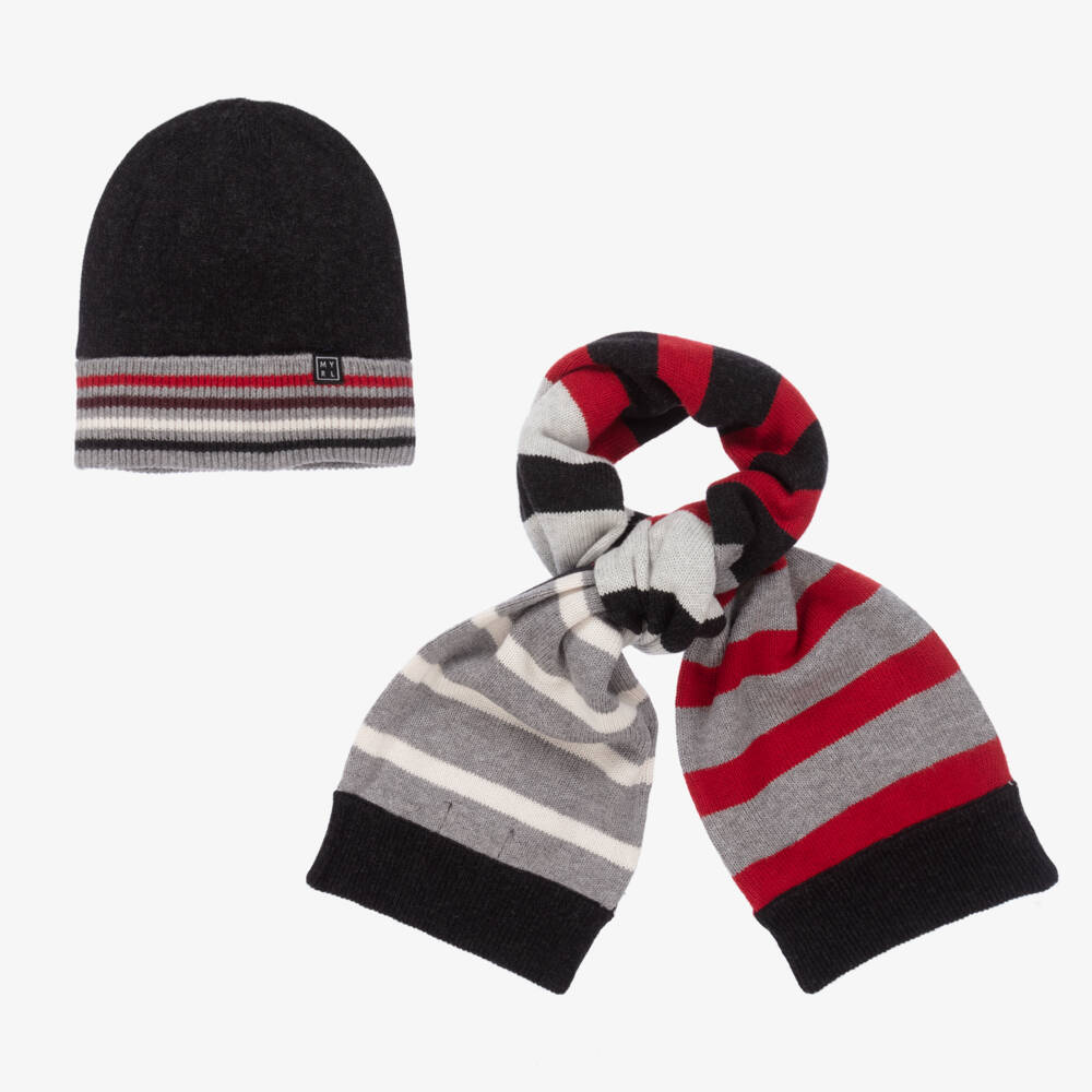 Gear up for the cooler months with this red, white and grey hat set for teen boys from Mayoral, made in a soft cotton and wool blend for warmth. The scarf has wide stripes on one side and is plain grey on the other. The beanie hat has thin stripes on the turned up brim, which is ribbed for a comfortable fit.