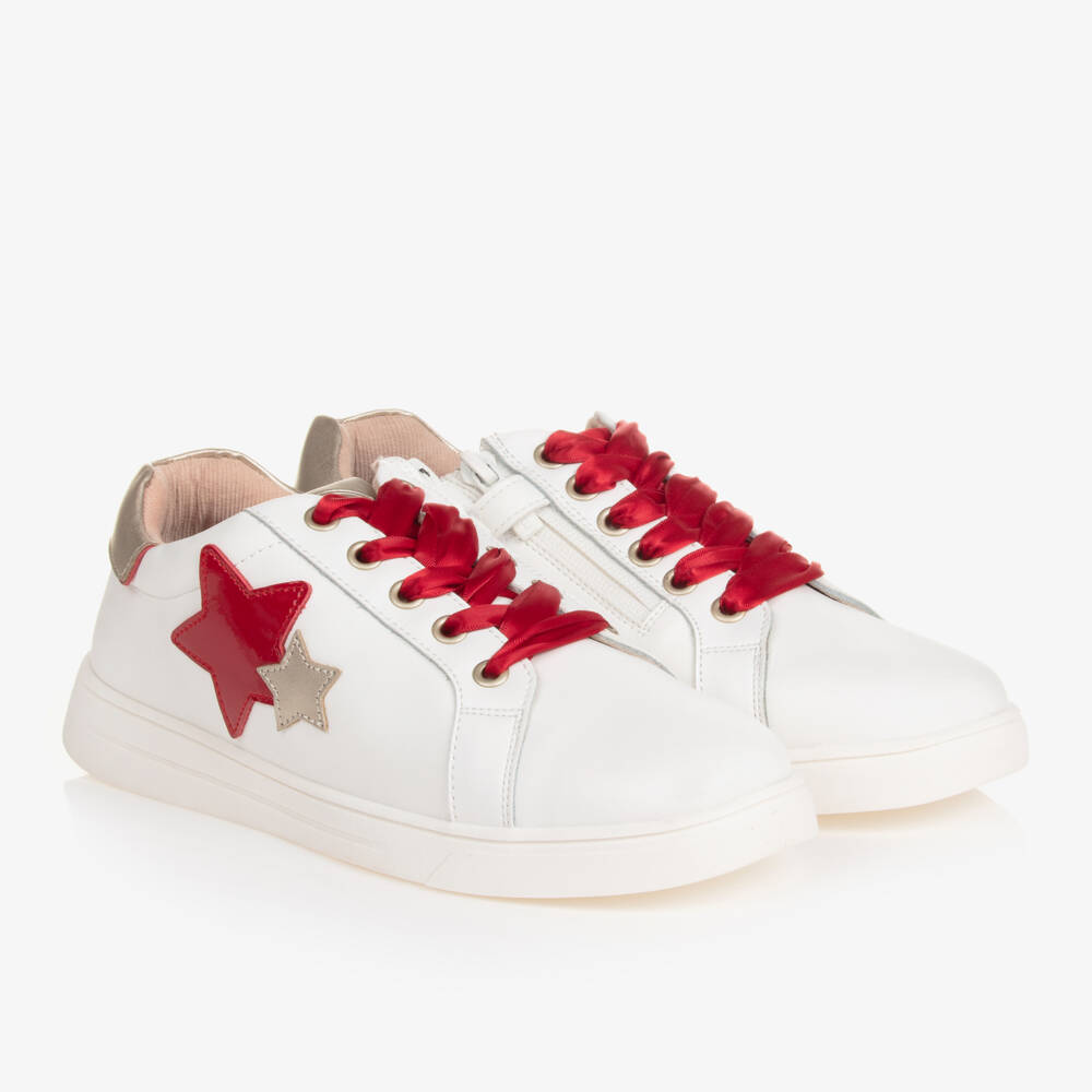 White leather trainers for teen girls by Mayoral, with star appliqués on the sides. Red and shimmering gold accents add complementary tones of colour to these girly shoes. In pale pink cotton needlecord, the soft textile lining ensures her feet stay cool and dry. The insoles are lightly cushioned, breathable and odour-inhibiting for comfortable wear. They fasten with silky red ribbon laces and the brand's embossed logo on the back adds designer appeal. They fasten with a zip on the side, secured with a velcro tab to keep it in place. The flexible, non-slip rubber outer soles provide good grip.