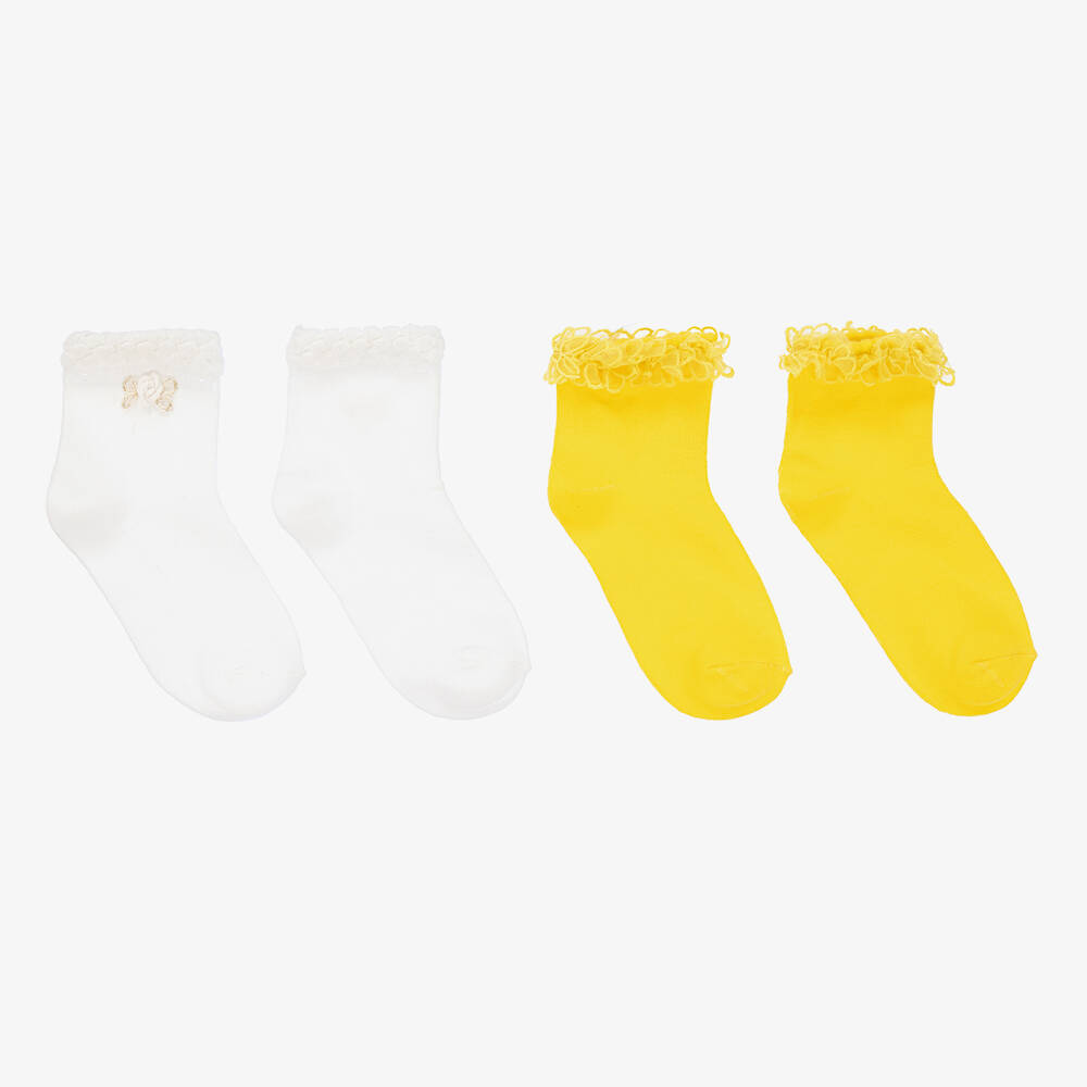 Two pairs of yellow and white organic cotton socks for teen girls from Mayoral. With feminine scalloped trims on the ankle, these stretchy knitted socks come in different designs. The yellow pair are detailed with lovely floral lace trims and the white pair have delicate white roses with gold glitter accents.