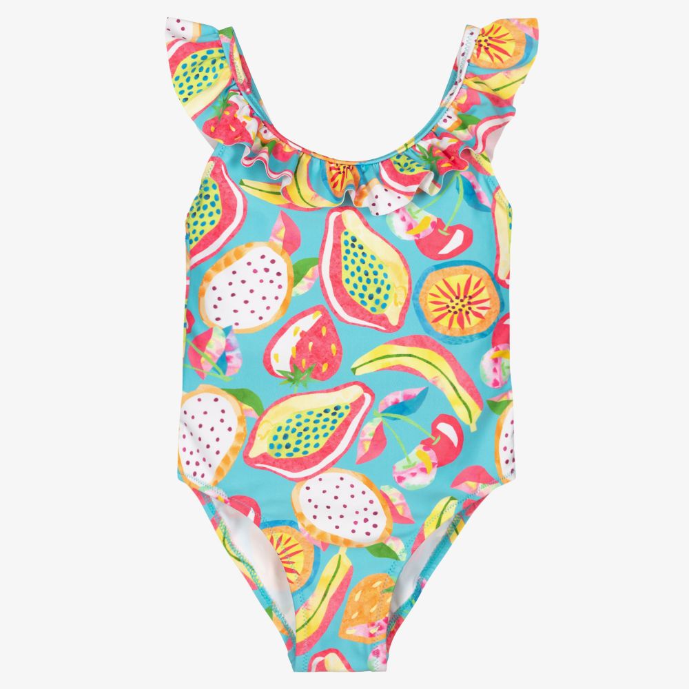 Pretty fruit print swimsuit for girls by Mayoral, in shades of blue, pink and yellow. Soft, silky and stretchy, there are lovely frill trims on the neckline and the deep scooped back.