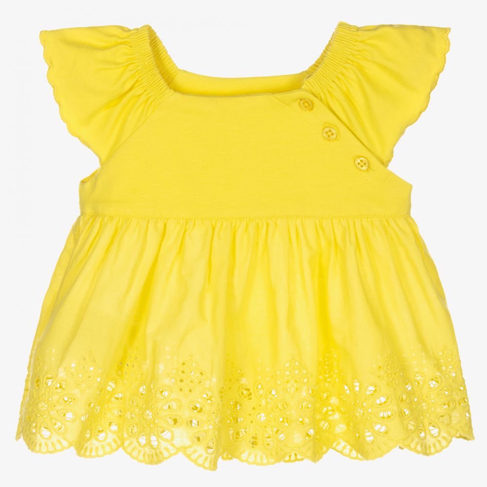 Pretty yellow cotton T-shirt for little girls by Mayoral. The bodice is made in comfortable jersey, with embroidered scalloped sleeves that are elasticated over the shoulders and have useful button fastenings on one side. The lower part is made in lightweight voile with lovely embroidered cut work around the scalloped hemline.