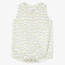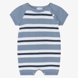 A traditional blue-grey and white cotton shortie by Mebi. The top of this sweet one-piece is softly knitted and styled with a gingham check collar to match with the lower, woven part. It fastens neatly on the back and between the legs with mother-of-pearl buttons.