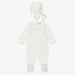 A white blouse and beige shortie set for baby girls by Mebi, made in soft cotton. The lightweight blouse has a fine stripe design with textured plumeti dots for a feathery effect. It has a sweet ruffled collar and elasticated frill cuffs. The knitted shortie is designed with mother-of-pearl buttons and crossover shoulder straps. The back of the waistband is stretchy for added comfort.