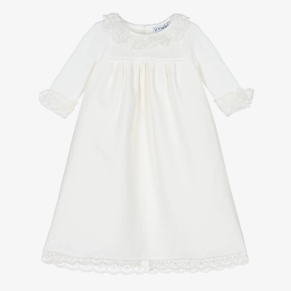 Lovely ivory ceremony gown for baby girls by traditional Spanish brand Mebi, ideal for christenings. The knitted bodice has a subtle line pattern, with gorgeous ivory lace trims on the neckline and cuffs. The long, honeycomb-patterned skirt is made in soft cotton, with pleats from the bodice, a lace trim on the hemline and a voile lining for comfort. It fastens on the back with little mother-of-pearl buttons. Mebi is a very small fitting brand, please choose a size up to allow room to grow.