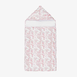Mauve pink baby nest for girls by Spanish brand Mebi, trimmed with adorable, decorative pom-poms on the front. With a beautiful bobble knit stitch, it is lined in super soft and cosy plush faux fur and fastens with a smooth zip.