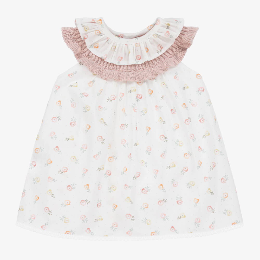 A sweet ivory dress for little girls by traditional Spanish brand Mebi, made in soft and lightweight cotton poplin. This sleeveless design has a pretty pink floral pattern, with a dusky pink knitted ruffle collar, trimmed with a woven frill. It has a delicate lace trim on the hem and fastens on the front with wooden buttons. Mebi is a very small fitting brand, please choose a size up to allow room to grow.
