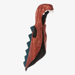 Fun for young dino enthusiasts, this dinosaur costume for boys and girls is by Meri Meri. The coppery brown cape is made in shiny lamé and has blue spikes along the back. The attached hood is softly padded and trimmed with felted facial detailing. There is a comfortable lightweight lining and an easy popper fastening at the neck.