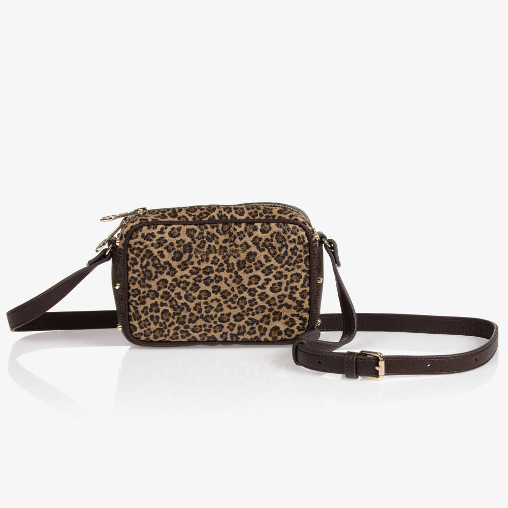 Girls beige and brown leopard print shoulder bag by Michael Kors, made in soft faux leather with a gold logo on the front. Lightly padded, the single compartment has a logo branded zip closure with golden stud details on the sides of the bag. The brown faux leather strap is adjustable and there is a brown trim around the sides and bottom with a dotted effect MK logo print.