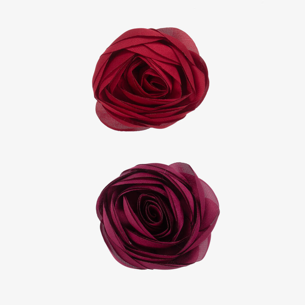Pack of two hand made hairclips for girls by Milledeux, exclusive to Childrensalon. Designed with metallic silver, nickle-free crocodile clips, they have gorgeous chiffon roses in two shades of red.