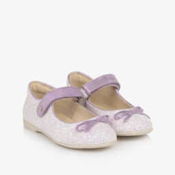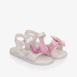 Sparkly pink sandals for girls by Mini Melissa, made in the brand's signature sweet-scented Melflex rubber. They feature delightful lilac butterfly decorations across the toe strap and fasten easily with velcro. Beautifully soft and comfortable to wear, they have a cushioned insole and a flexible outsole, lightly ridged for improved grip.