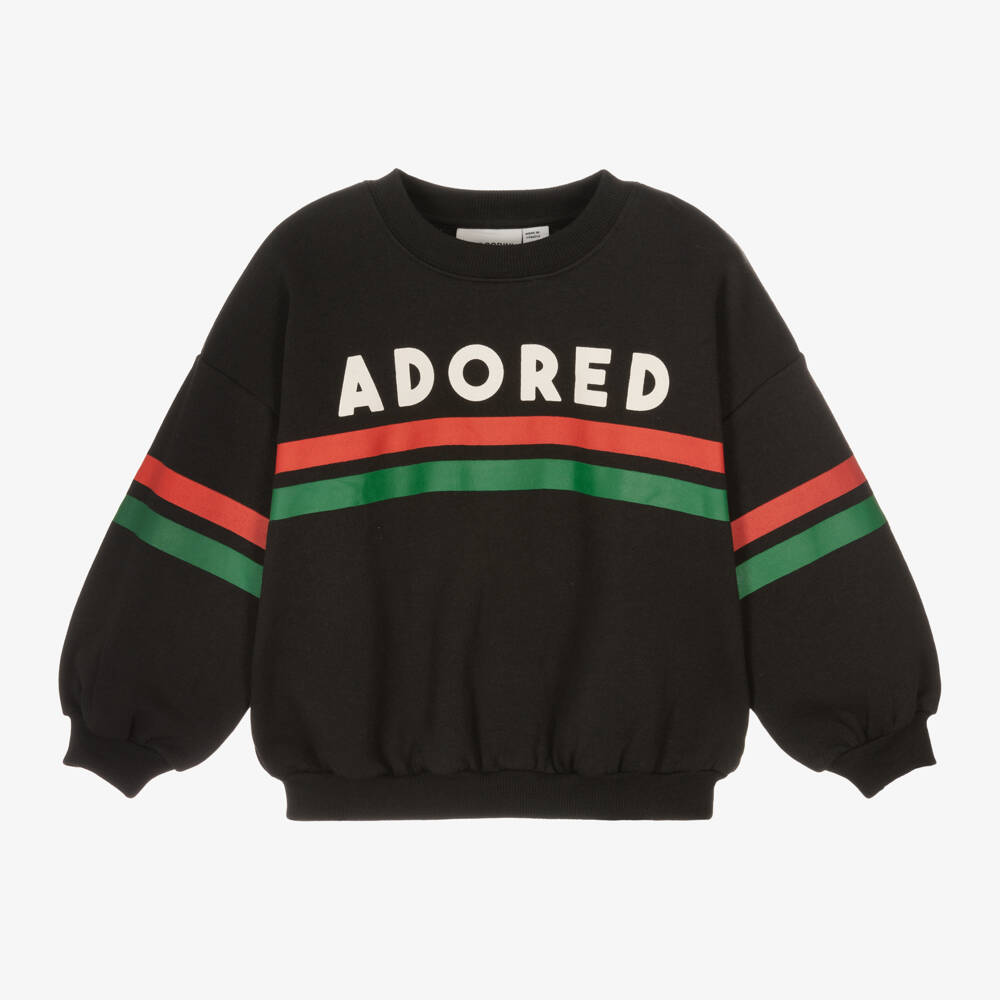 A washed black graphic sweatshirt for boys and girls by Mini Rodini, made from soft organic cotton jersey. It has an ivory 'Adored' slogan printed on the front with red and green stripes for a playful streetwear look. The ribbed crew neck, gathered trims and dropped long sleeves offer a laid-back finish.