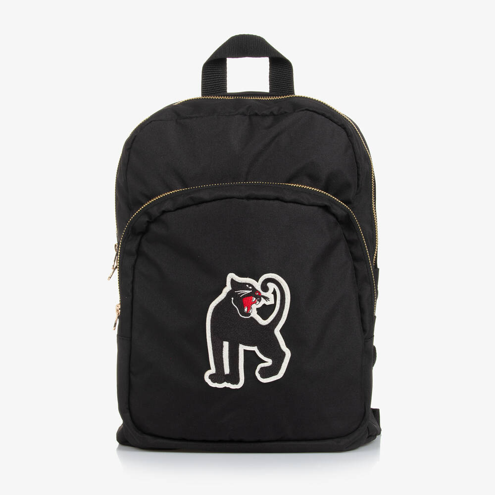 A black water-repellent backpack for boys and girls by Swedish brand Mini Rodini, with a cool, black panther appliqué on the front. Fastening with shiny gold zips, this practical bag has a spacious main compartment with an internal zip-up pocket, ideal for securing smaller items. There is a further compartment on the front for extra storage and a useful carry handle on the top. The padded shoulder straps can be easily adjusted to ensure a comfortable fit.