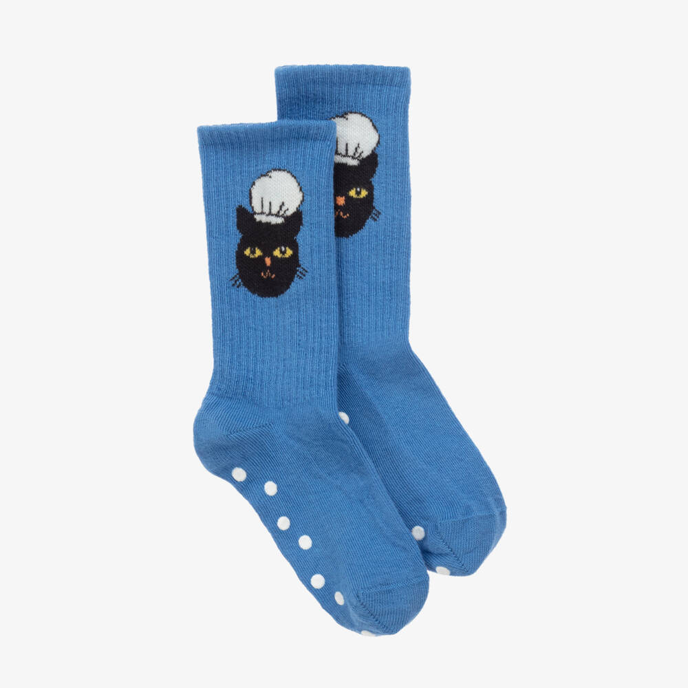 Fun blue ankle socks for boys and girls by Mini Rodini, knitted in a soft and stretchy organic cotton blend. They have quirky Chef Cats embroidered on each ankle, to add quirkiness to each outfit they accompany. The bottoms of the feet have useful rubberised pebbles, in the shape of the brand's logo, for extra grip.