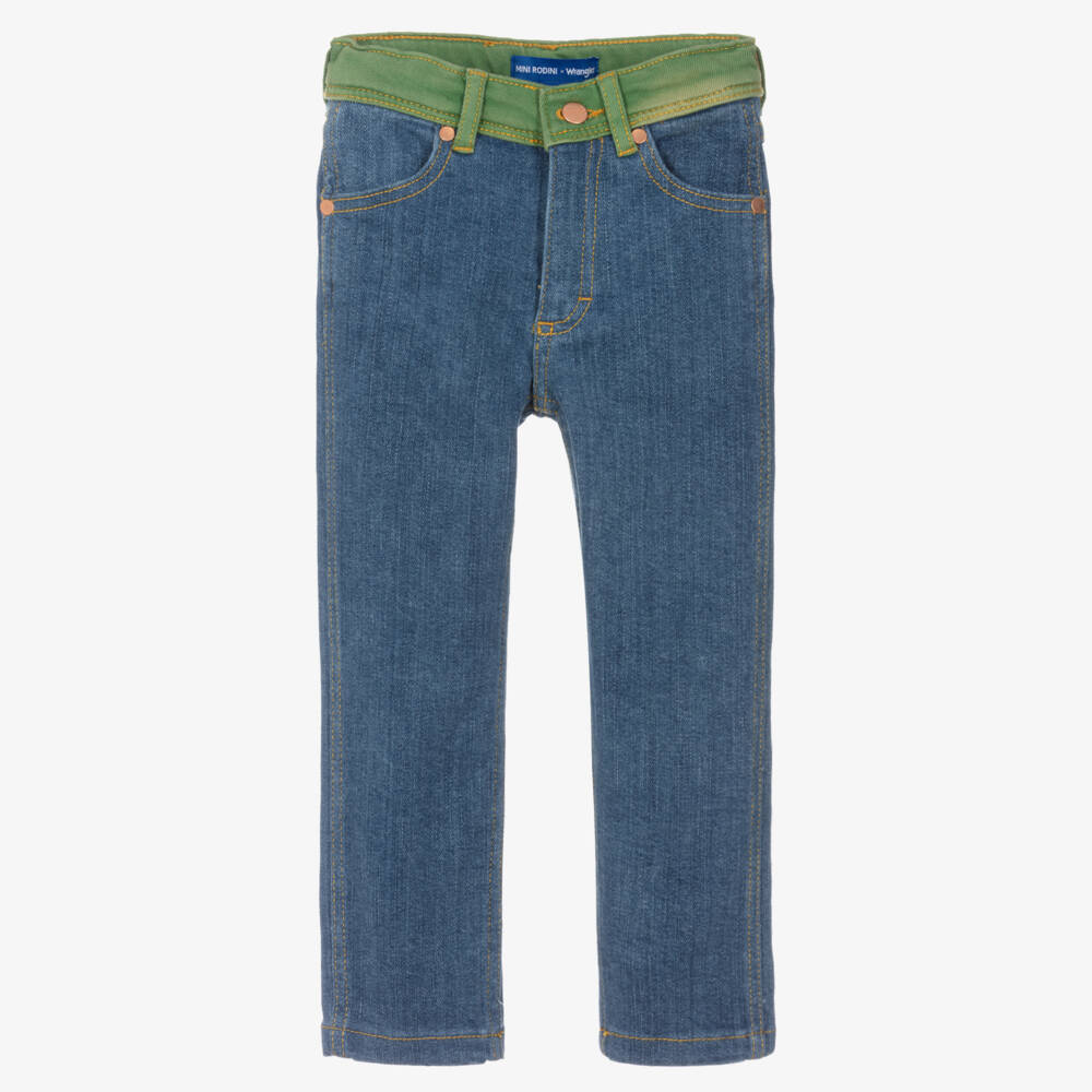 Super cool, these blue jeans for boys and girls by Mini Rodini are designed in collaboration with Wrangler and have a classic straight fit. Made from organic cotton, they have a green adjustable waistband and matching patch pockets on the back with a branded log patch. There are useful pockets on the front with copper rivet detailing, and a front zip and branded button fastening.