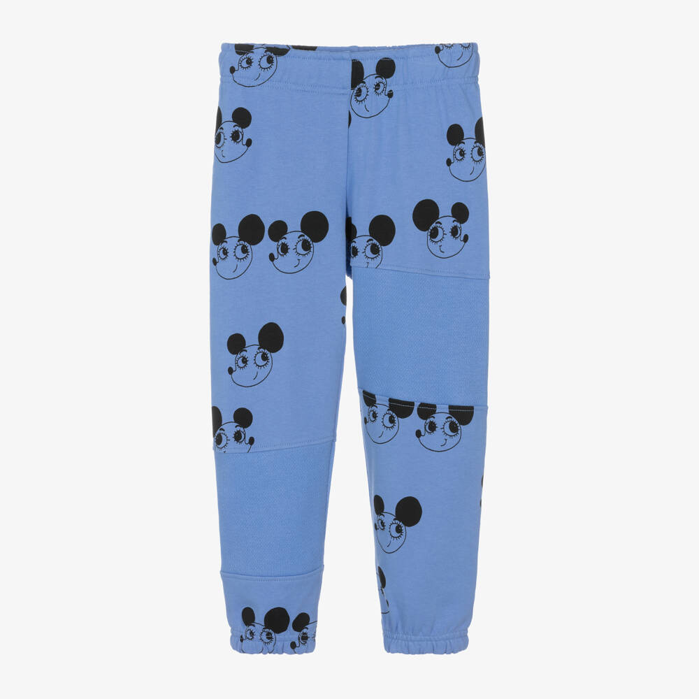 A pair of cornflower blue joggers for boys and girls by Mini Rodini, with the brand's signature Ritzratz pattern in black. Made from soft organic cotton looped-back jersey, they have asymmetric plain mesh jersey panels for a textured contrast and cuffed ankles. Comfortable and casual, the waistband is elasticated and has an internal drawstring for an adjustable fit.