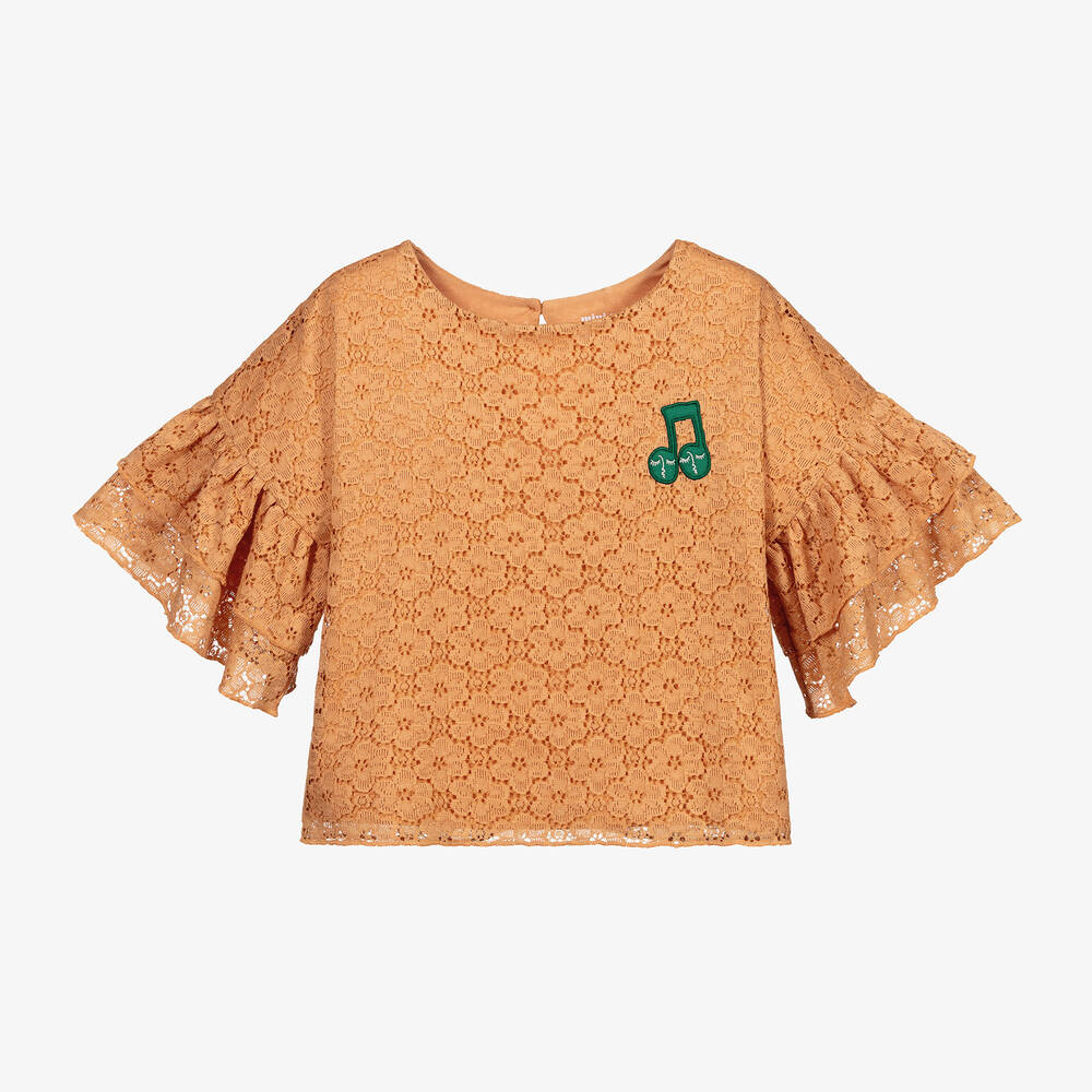 Girls beige lace top by Mini Rodini, with green musical note appliqué and 3/4 length ruffle sleeves. It is lined in soft and stretchy jersey and fastens with a button on the back.