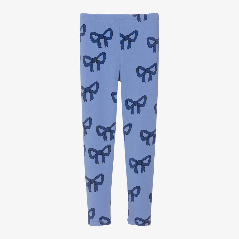 Cornflower blue leggings for girls by Mini Rodini, made in soft and stretchy organic cotton jersey. These full-length leggings are printed with bow graphics in a darker shade of blue for a fun and playful look. They have an elasticated waistband, designed for comfortable wear and easy movement.