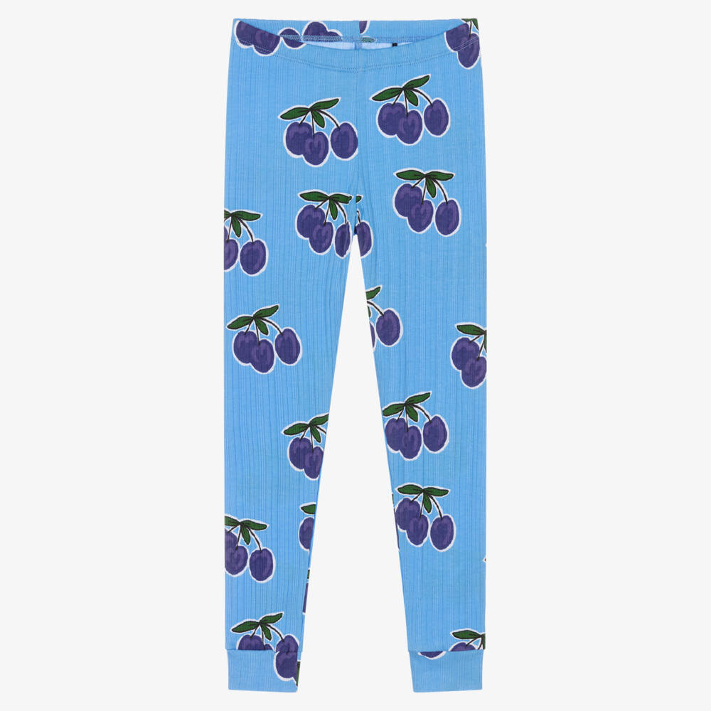 Blue leggings for girls by Swedish brand Mini Rodini, with a bold plum print in purple and green. Made in soft and stretchy organic cotton jersey with a ribbed texture, they have a comfortable elasticated waist and ribbed cuffs.