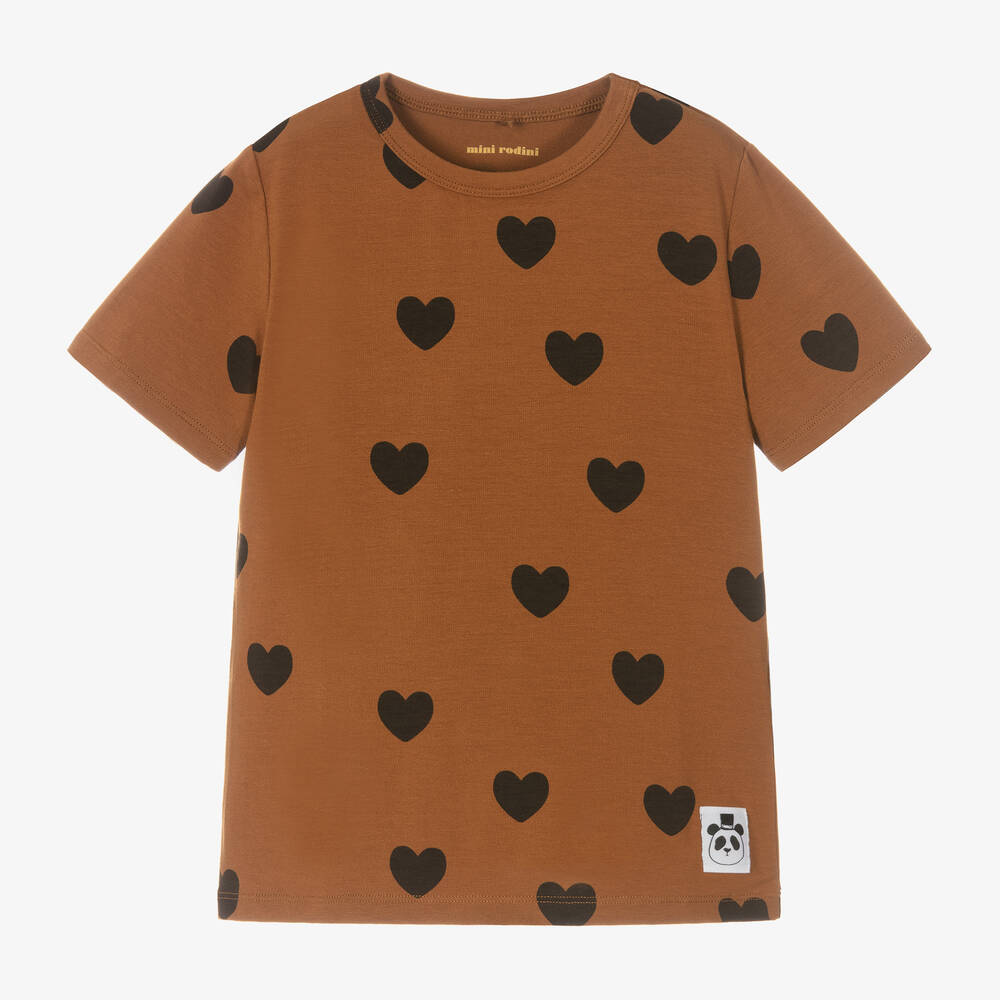 Stylish brown lyocell T-shirt for girls by Mini Rodini, with an all-over black heart pattern and cute white panda motif patch above the hem.