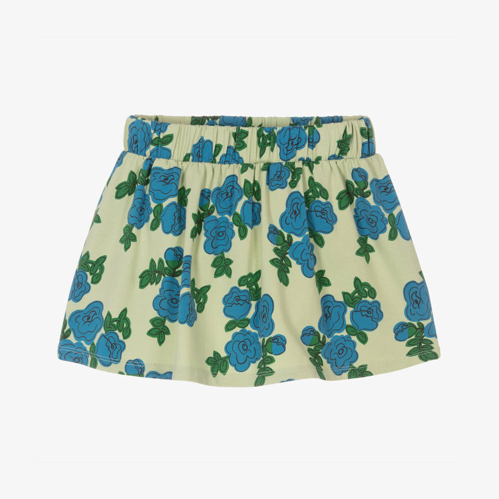 Green jersey skirt for girls by Swedish brand Mini Rodini, made in soft organic cotton. This casual style is patterned with pretty blue roses, hand drawn for an artistic Mini Rodini flair. It has an elasticated waistband for comfort and easy dressing.